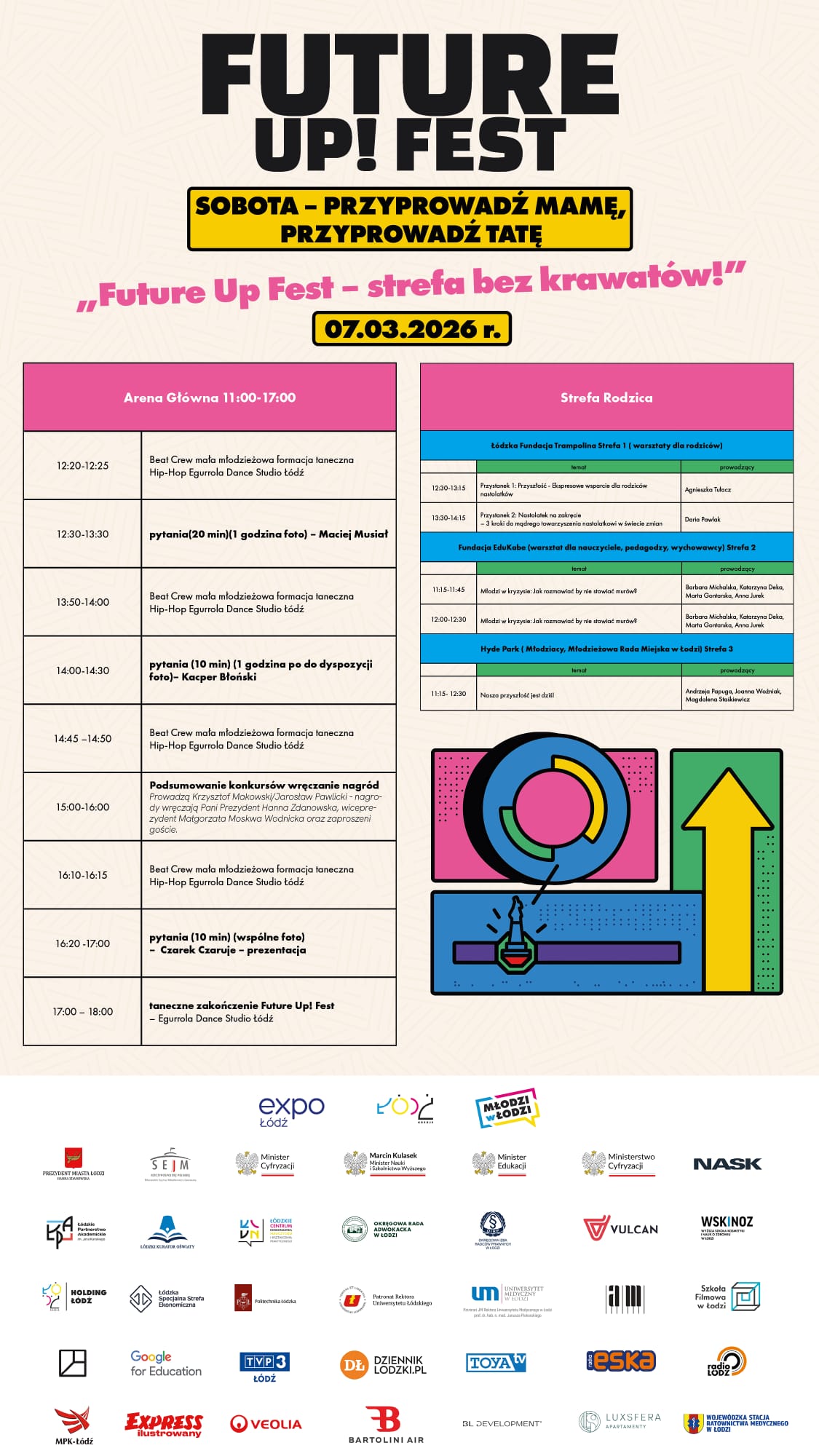 Future Up! Fest – kierunek: przyszłość, którego pierwsza edycja odbędzie się w dniach 5–7 marca 2026 roku w hali Expo Łódź, to innowacyjny festiwal edukacyjny skierowany do młodzieży w wieku 13–19 lat, w szczególności do uczniów klas VII i VIII szkół podstawowych oraz szkół ponadpodstawowych.